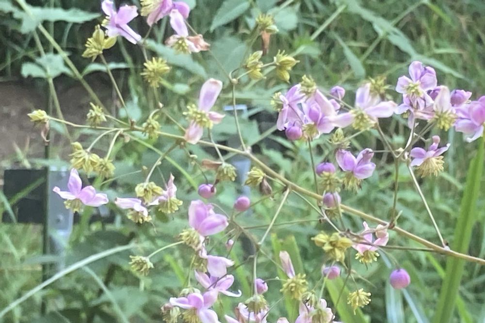 キンポウゲ科カラマツソウ属の多年草。この和名の由来は、カラマツソウの仲間で、萼が紫色、葯が金色(黄色)からきているそうです。