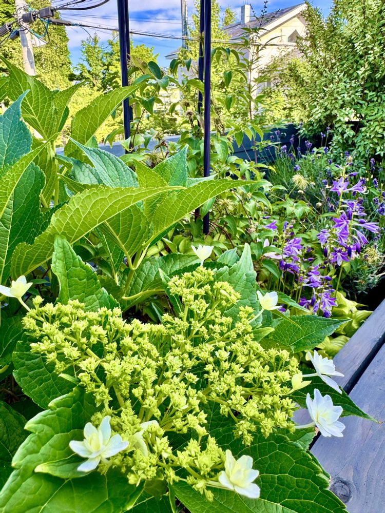 ②株分けしたギボウシが後ろで咲いてます💜紫陽花の墨田の花火が