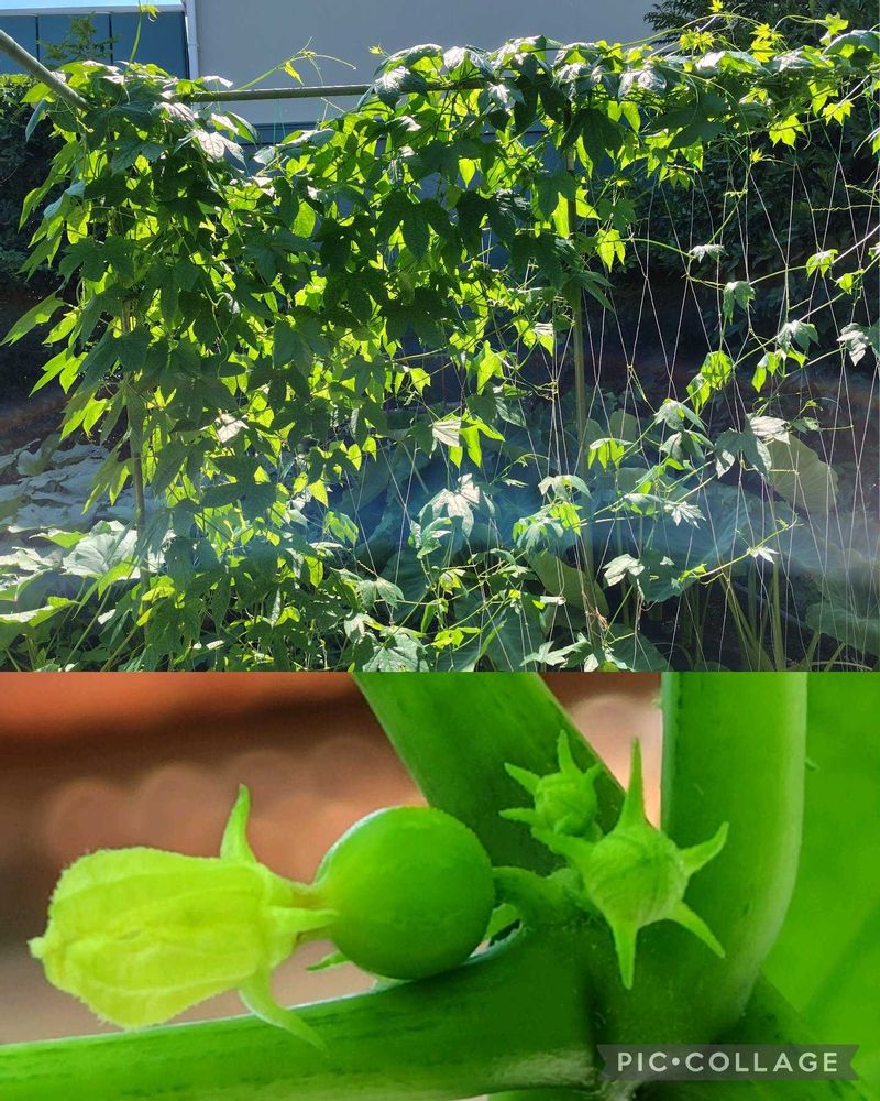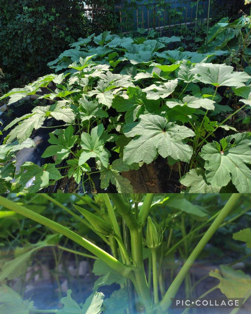 ①オクラの葉っぱが大きくなって、掻き分けて見ないと実がなっているかどうかもわからない見逃して 15cm くらいになってる 実もたまにある固くて食べれません😂