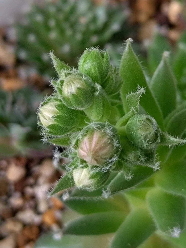 ❸センペルビウムの蕾が色付いてきました、投稿されたお花をみるとピンクの花弁、中心が赤い可愛いお花ですね💕