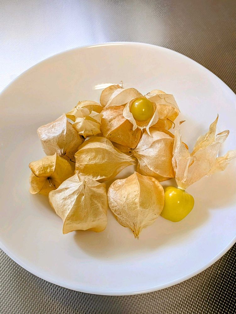 食用ホオズキの皮を剥くと黄色、ちょっとグリーンぽい黄色も甘すぎなくて美味しいです