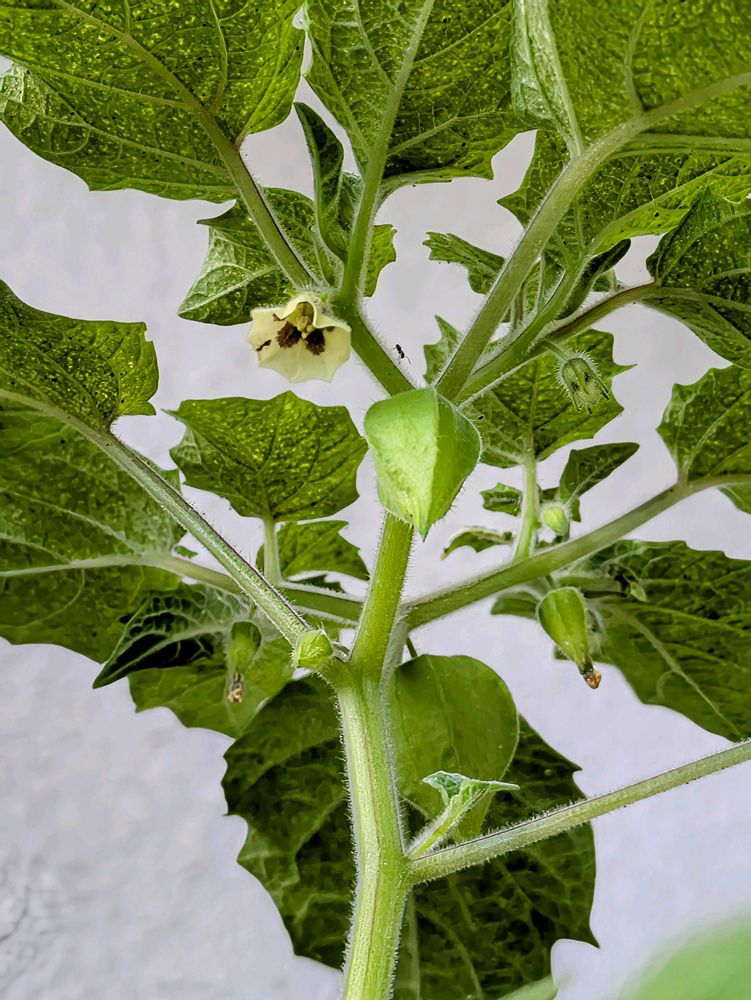 食用ホオズキは連日の暑さのせいか葉が黄色くなって元気がないです