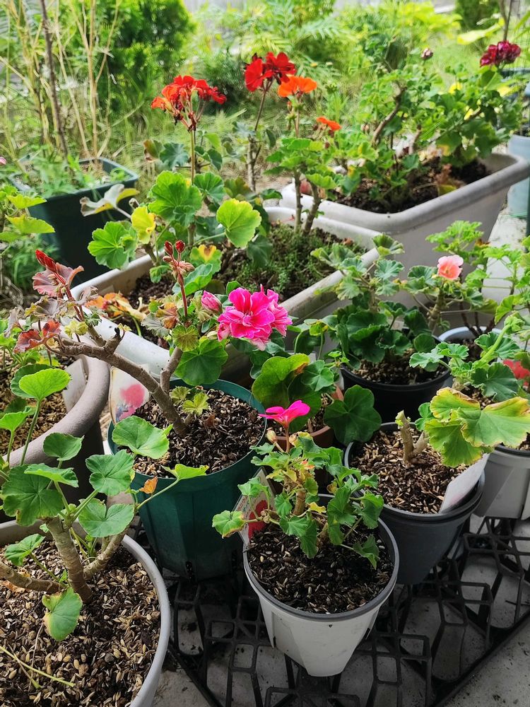 ✧︎暑さで息も絶え絶えになってたのを全員回収して土を増やすために寄せ植え&鉢増ししてカーポートの下に避難中のゼラニウム達