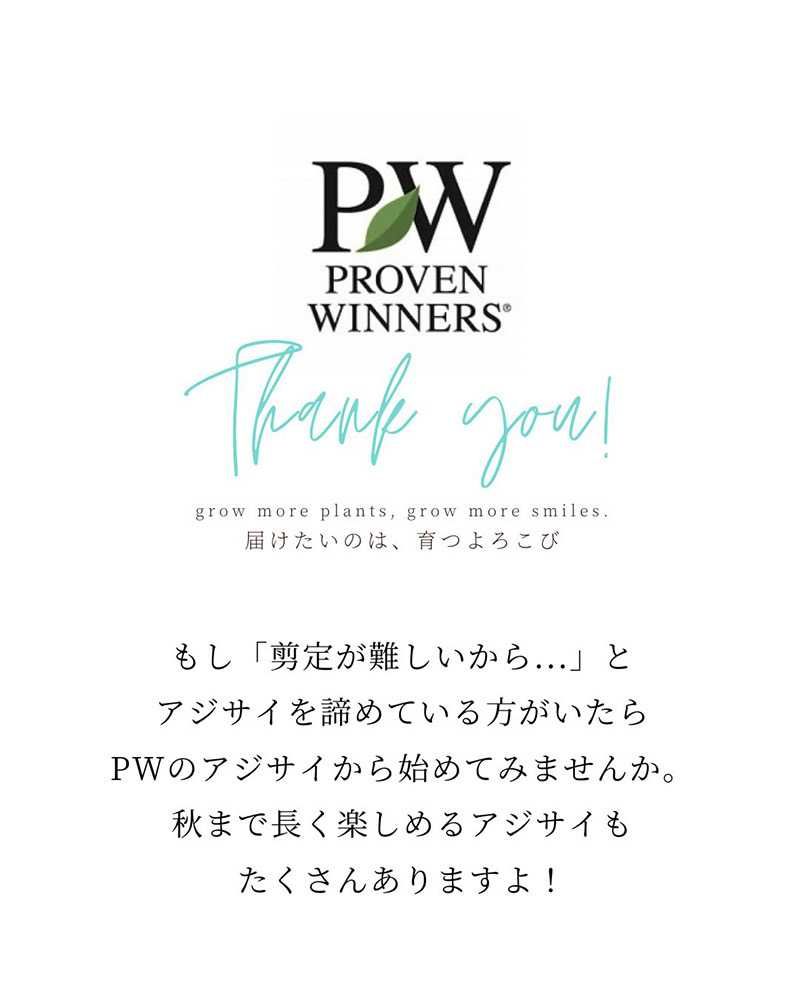 もし「剪定が難しいから...」とアジサイを諦めている方がいたらPWのアジサイから始めてみませんか。秋まで長く楽しめるアジサイもたくさんありますよ!