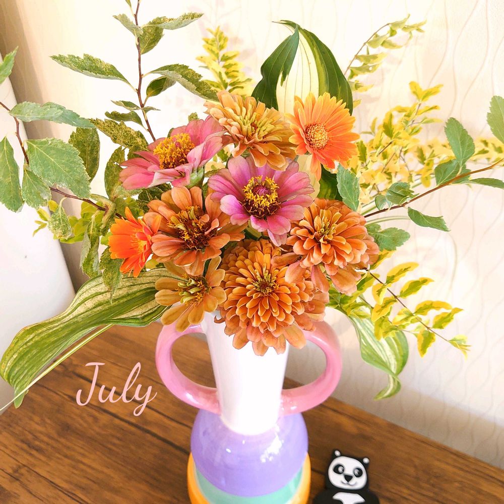 最近ゲットしたカラフルなフラワーベースにジニアやガーベラを飾ってみました🌻🌼