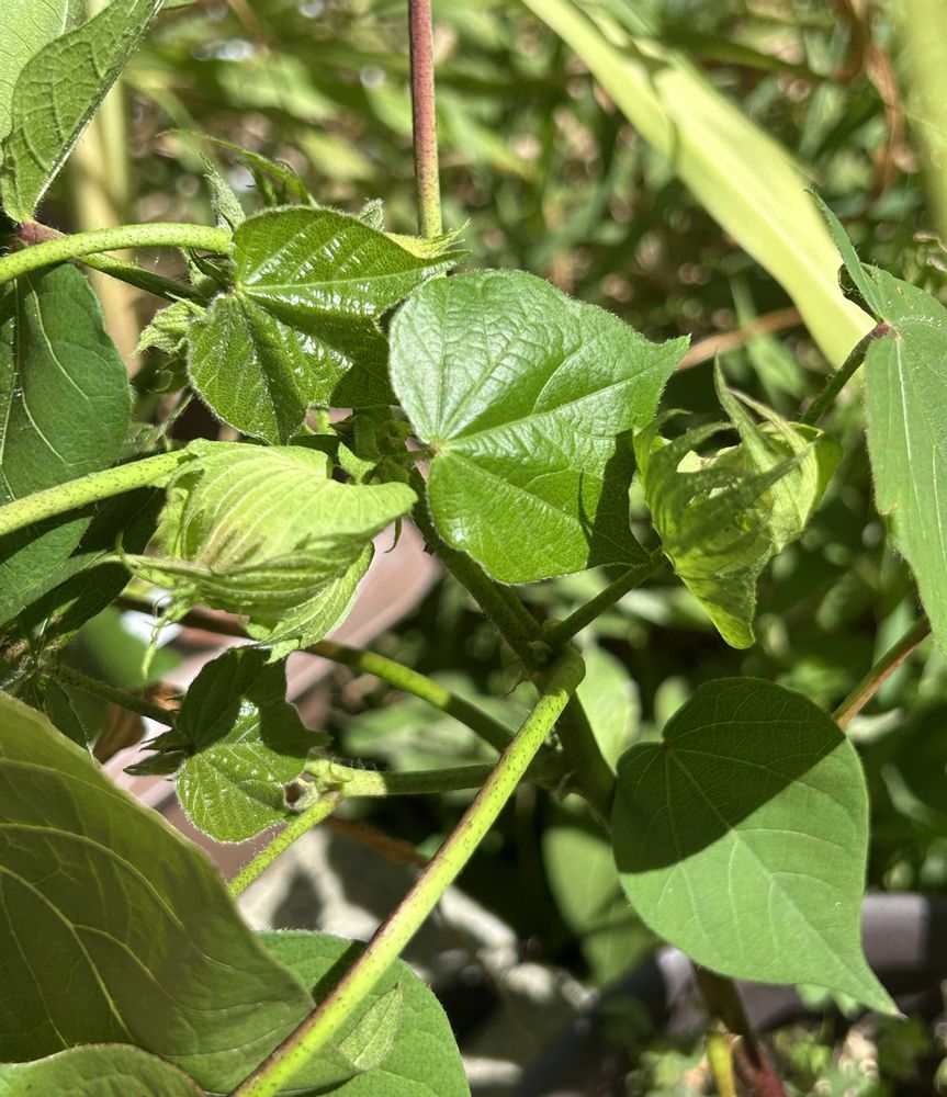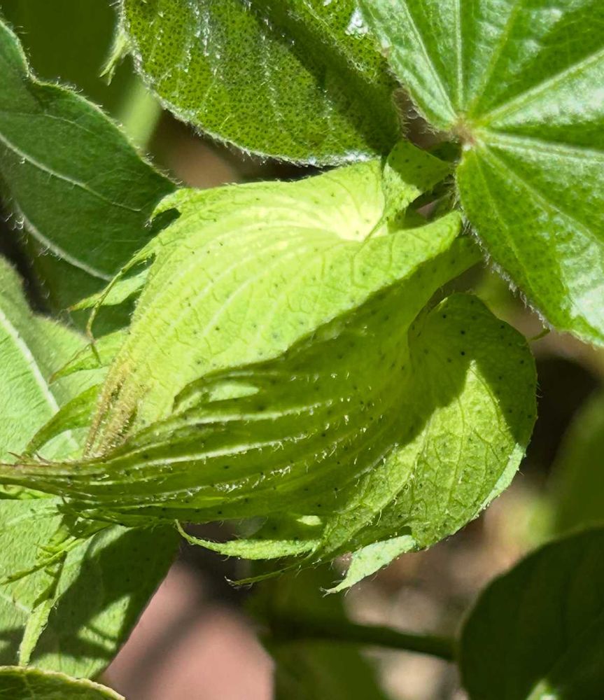 わかりにくいけどワタの蕾です。今年は3色種まきしたんですが2本発芽…だから何色でしょうね…楽しみ➰