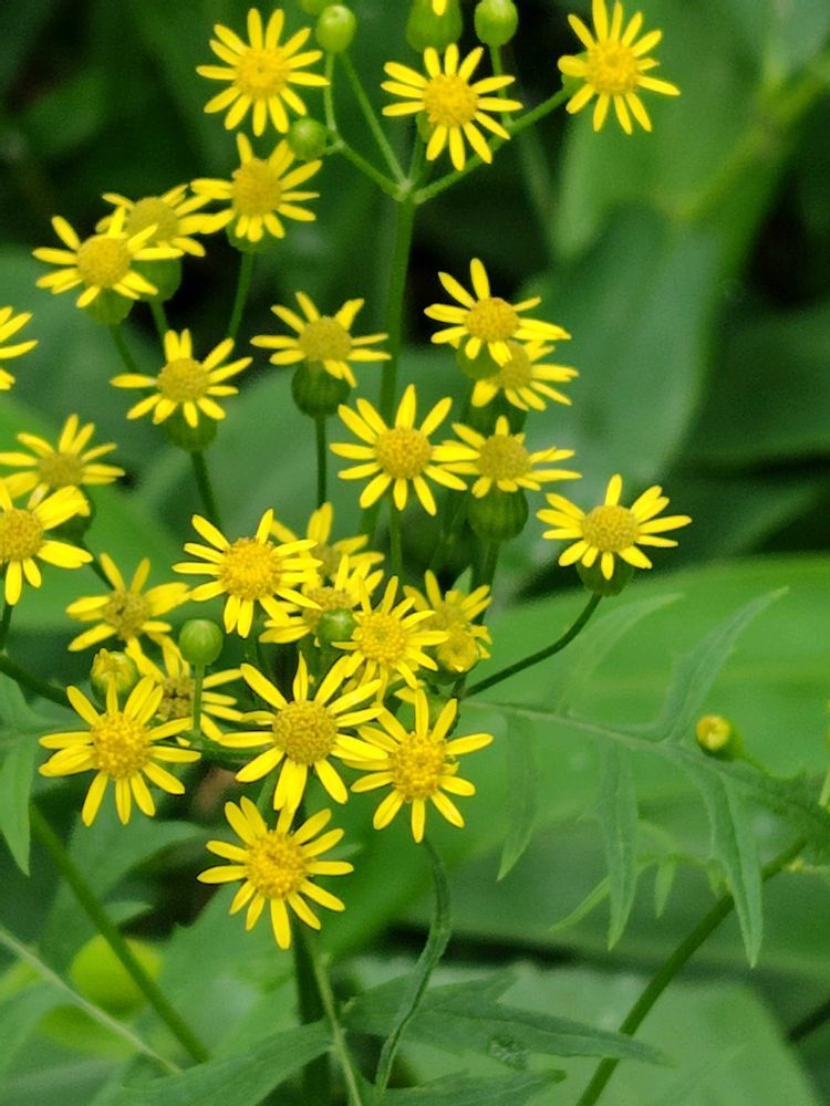 茎頂に散房花序を出し、黄色い花を咲かせる。頭花は舌状花で7〜13個付く。