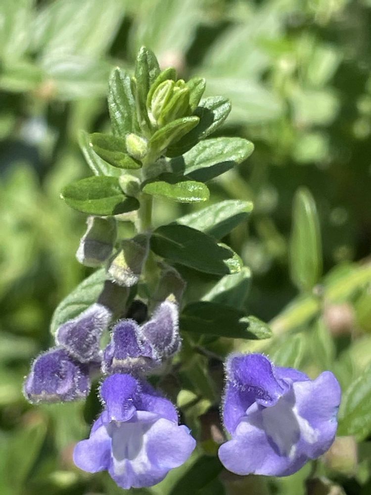 花冠は長さ2-2.2cmになる青紫色の唇形で、筒部は長く、基部で急に折れ曲がって直立する。