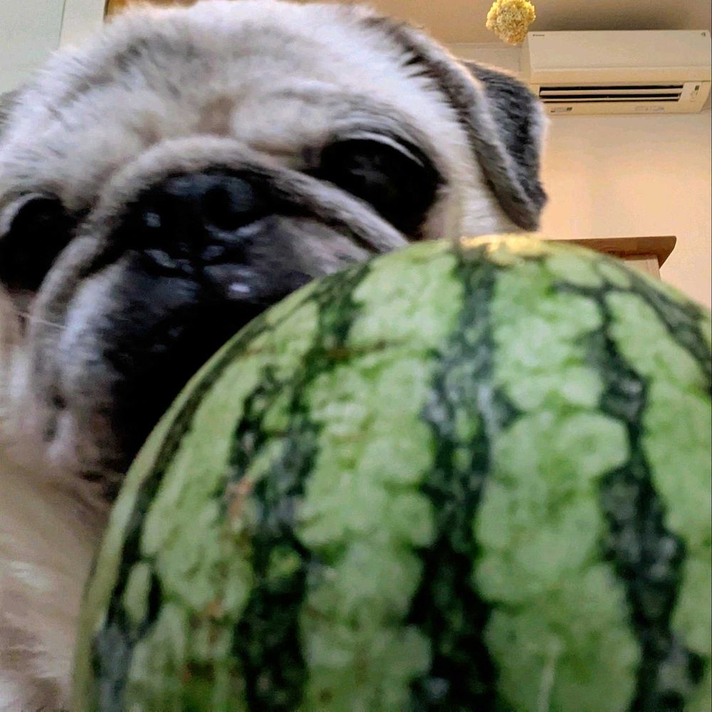 🍉と🐶せっちゃんの顔…どっち大きいかな?(笑)…せっちゃん、🍉をガン見😲💦