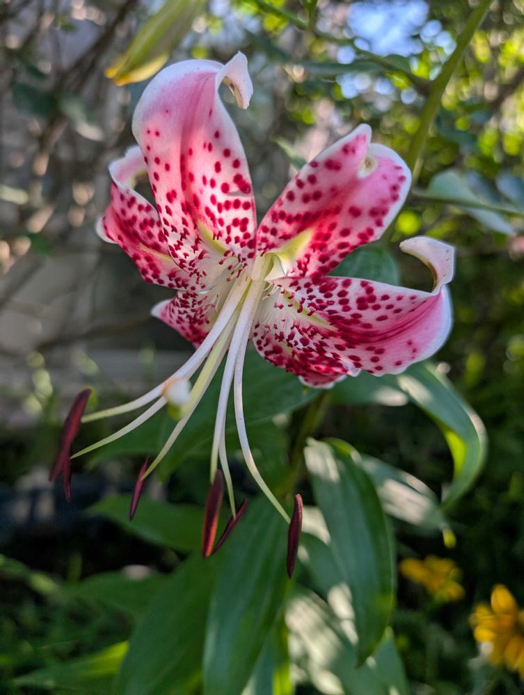 ピンクの花弁に赤い斑点、可愛いですね🩷「朝日浴び輝く姿鹿の子百合」(作者不詳)