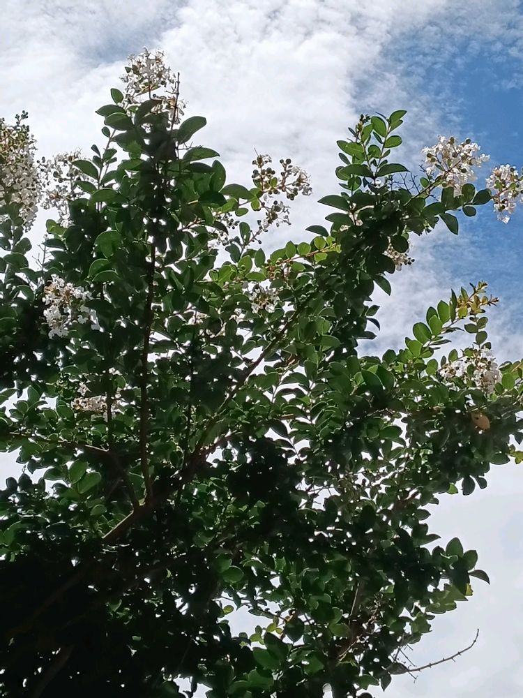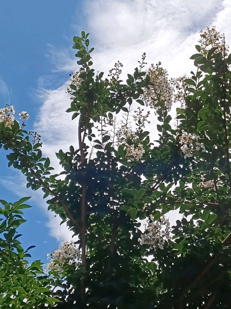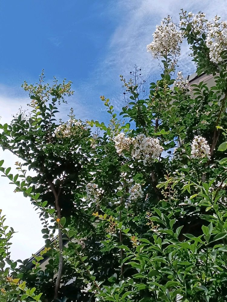 ①②③お庭のサルスベリ、今年も元気に咲いています…青空に白いお花が映えますねぇ〜✨️(*˘︶˘*).。*♡