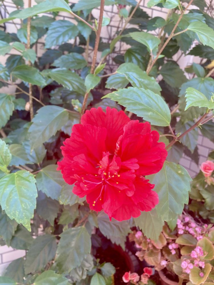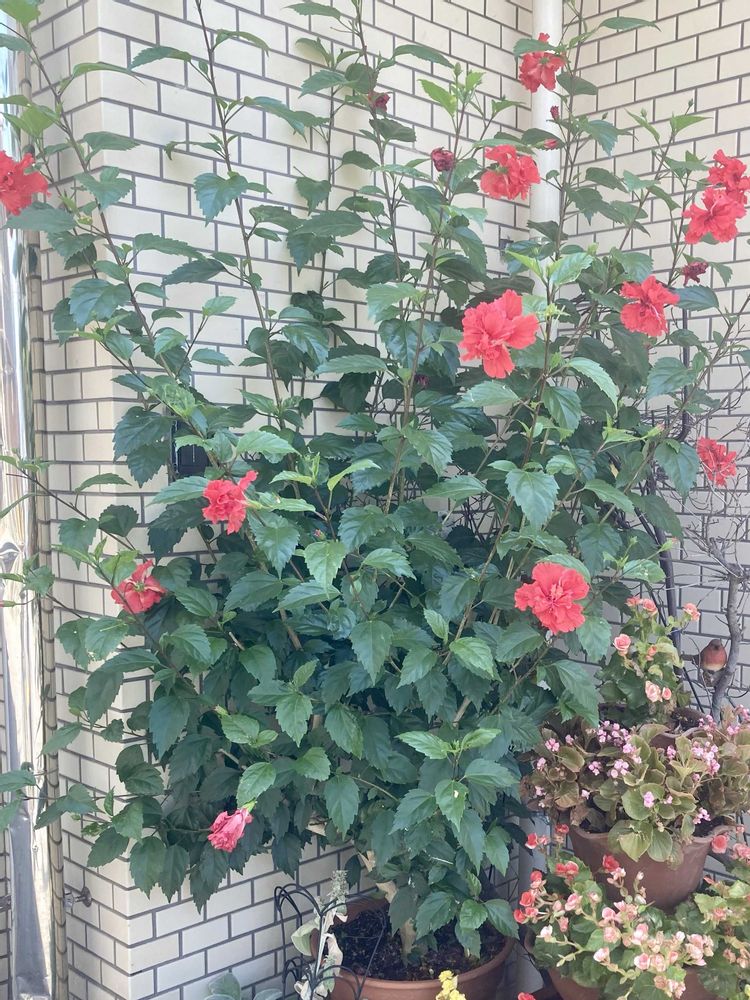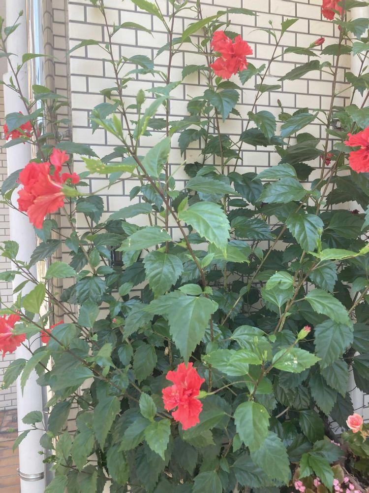 検索してみたら、一般的に「ハイビスカス」と言われている「ブッソウゲ(仏桑花)」らしい。
