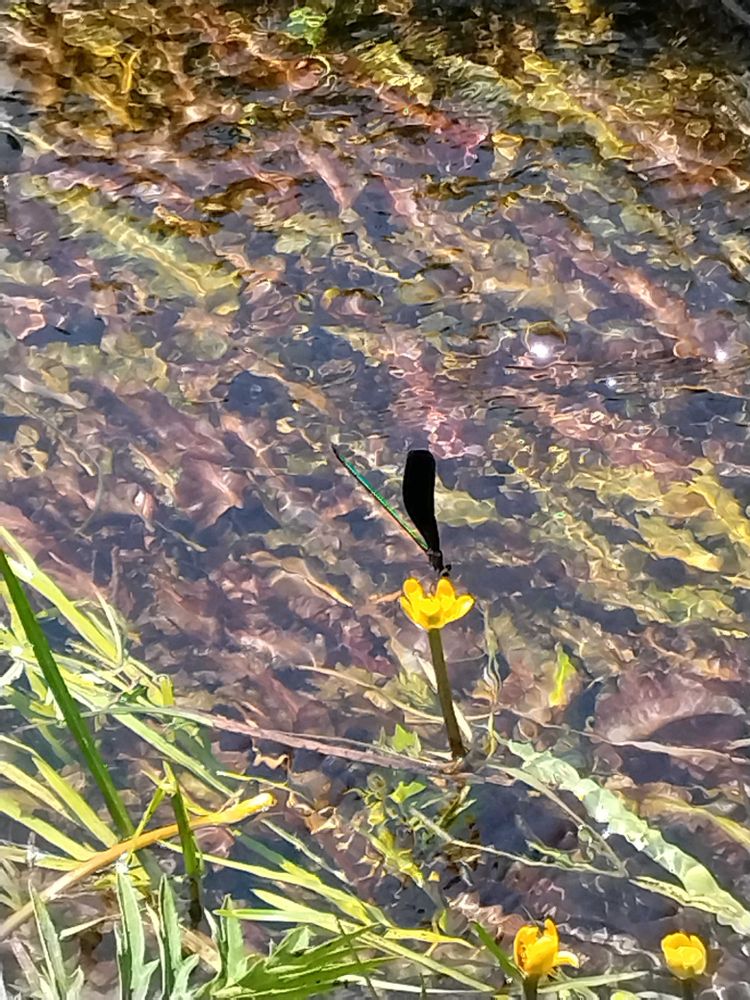 キレイなお水ですねぇ〜黄色いお花🌼が気持ち良さそう😊ハグロトンボの飛び方ゆるくて癒されますね。我が家の庭にも昨日から出現中です💕