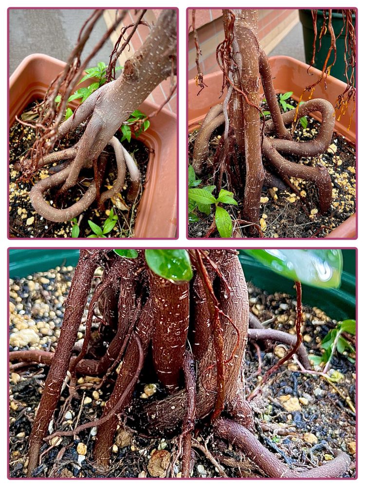 挿し木のものは根本が太くならないとかいてあったので、前回の植え替えの時に土の中の根を少し出してガジュマルらしく植え替えしてみました。可哀想に前の鉢が小さかったので根が暴れてました🙇🏻♀️🙇🏻♀️🙇🏻♀️