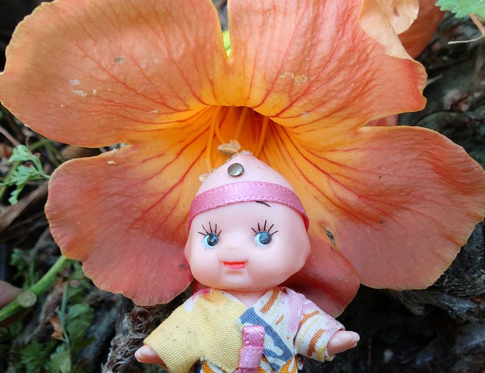2枚目 沖縄キュピちゃんがノウゼンカズラのおぼうぼ被っているみたいで素敵〜💕💕💕
