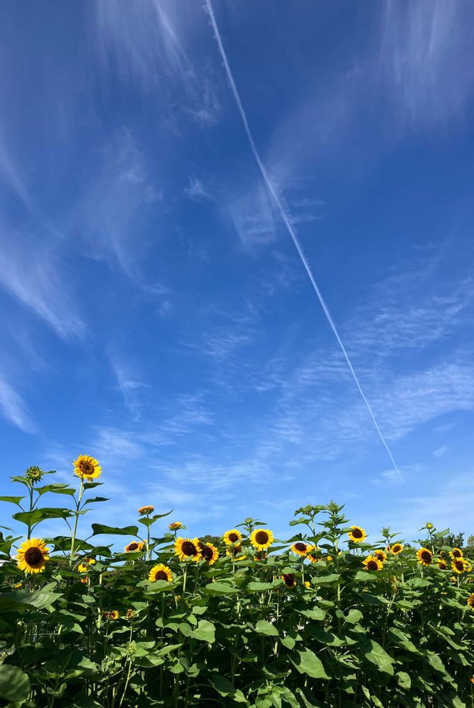 青い空、ひまわり🌻、飛行機雲☁️✈️