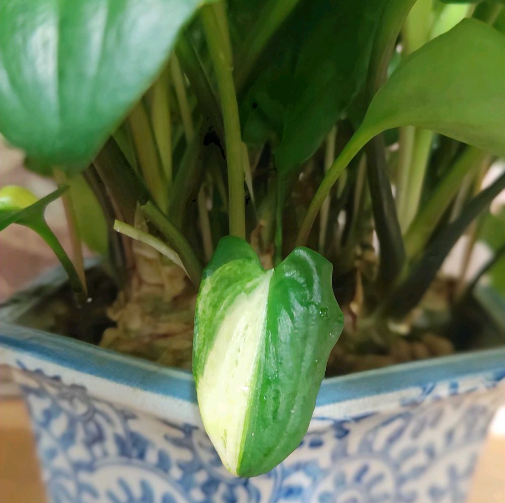 活力水のモニターで観察した、ドリミオプシスマクラータは鉢いっぱいに球根も増えて、斑入りの新芽も順調。ドットが薄くなってきた。こちらは、休眠期の冬まで待って植え替え予定。