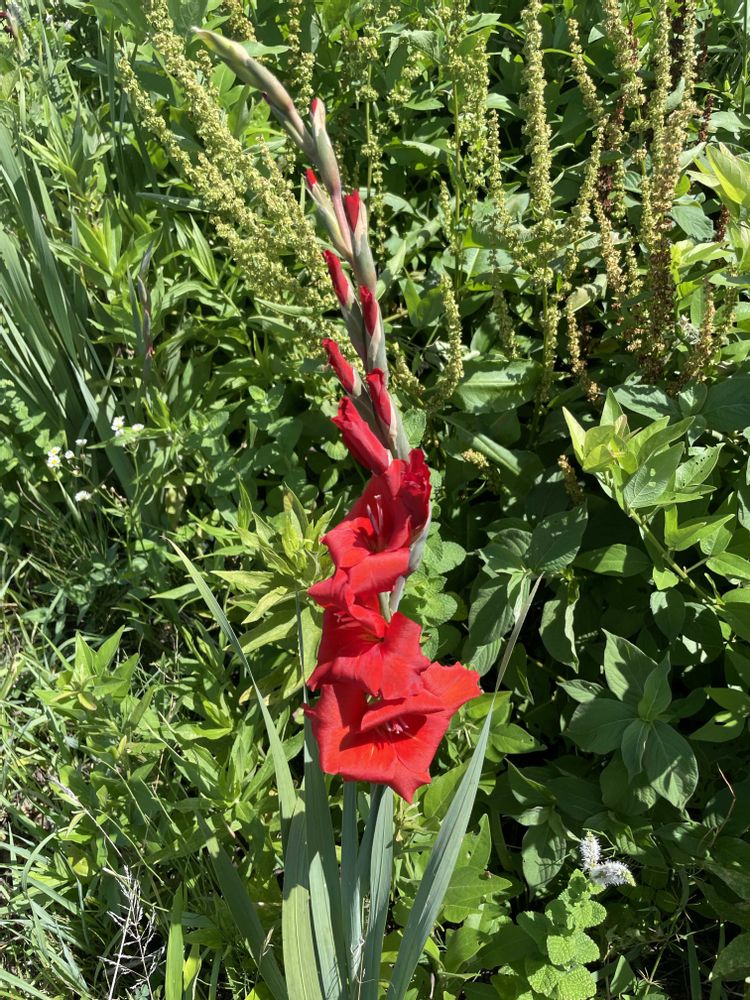 真っ赤なグラジオラス、燃えるような色🔥きょうも暑くなるから、かき氷🍧でも