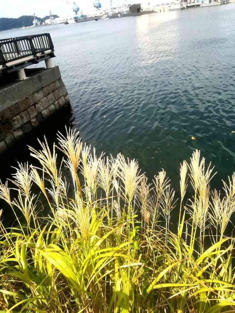 岸壁にすすきが生えていました。向こう岸は、米海軍横須賀基地。潜水艦が、すごい勢いで排水をしていました。