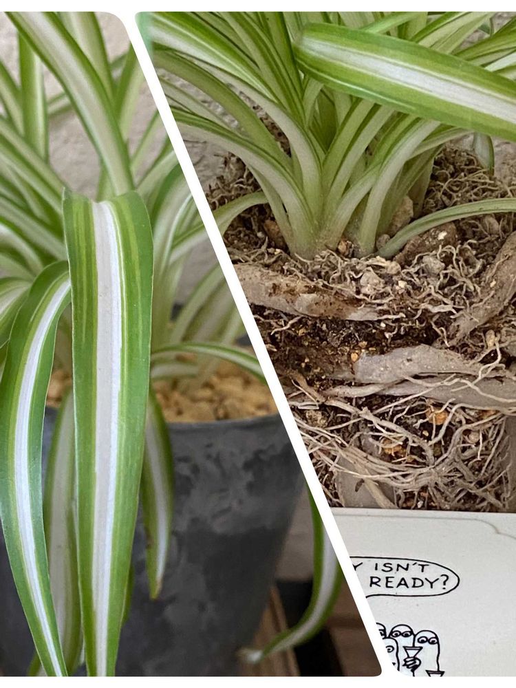 オリヅルラン✨表土から根っこが盛り上がってはみ出していました😅➡️取り急ぎ引き抜いてニョロニョロ根っことご対面、鉢増しで対処して数週間の今、もう元気なようです🌱