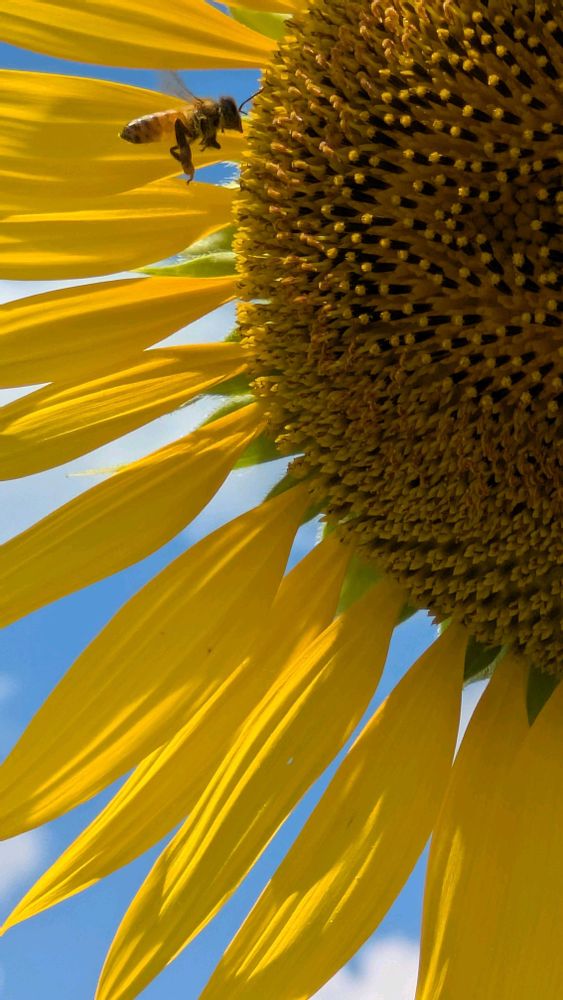 1枚目の写真、ミツバチがいて、青空が花弁の間から見えて、ダイナミックなアングルで素敵な写真ですね🌻
