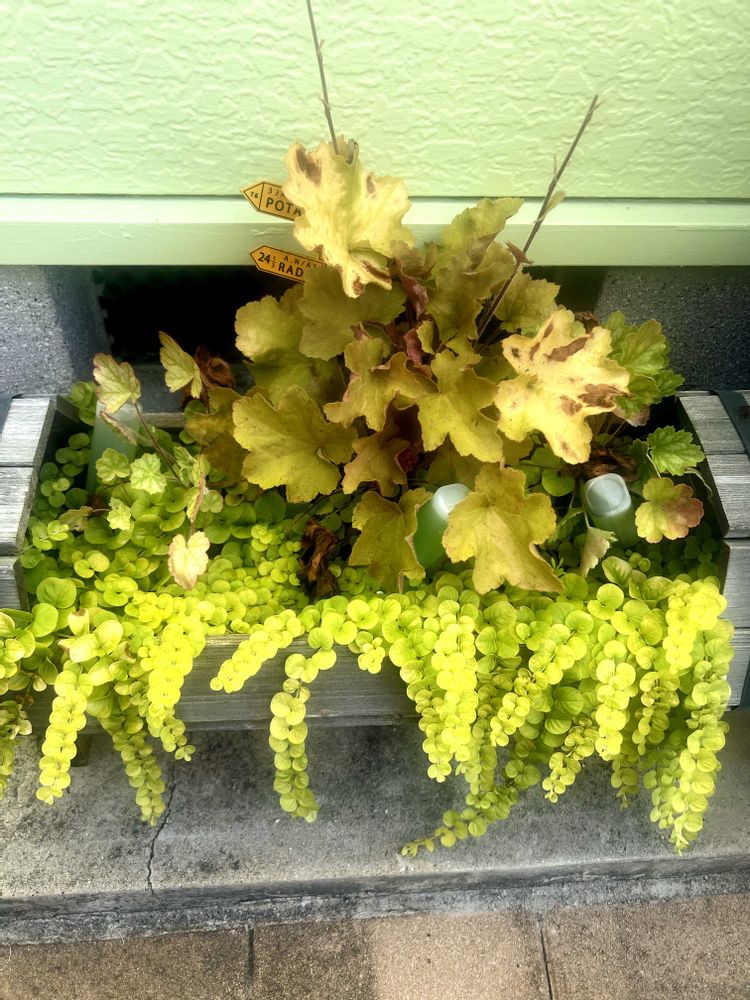 日向に置くとヒューケラがグッタリするし、日陰に置くとリキマシアがヒヨヒヨになるしで、相性イマイチな寄せ植え🤣
