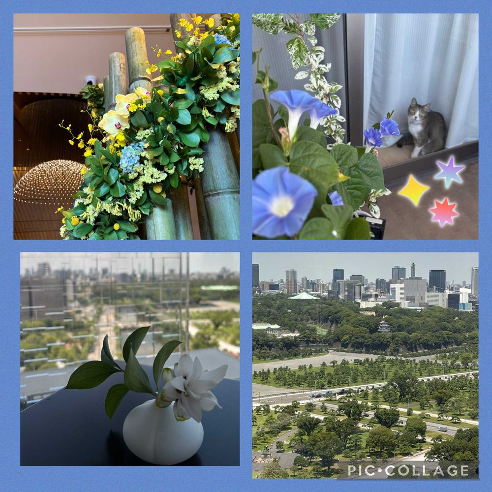 外出先のホテルロビーの生花とレストランからの皇居周辺の景色です。