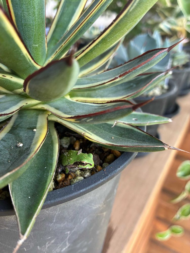 連日の猛暑、軒下のアガベにアマガエルが涼んでいました。