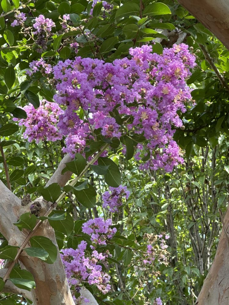 今日の百日紅の木は、木肌が艶々でとても綺麗でした。とても良く手入れされているようで、まとまって出ている木々の真ん中に可愛い苗木のような小さな木がお花を咲かせていました。2枚めです。