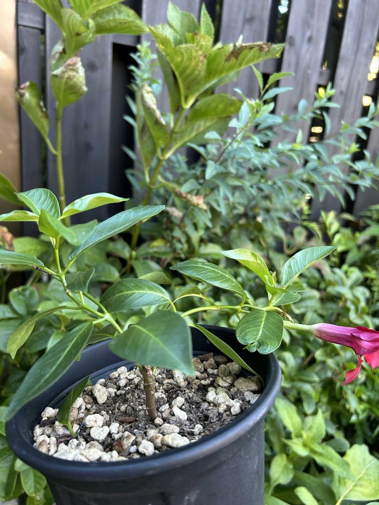 🏡のマンデビラ 冬越し出来て 庭植えした後 蕾2つ💡でも一輪枯れて 🤍咲いた後 ぐったり(ヽ´ω`)✂しました(-_-)zzzお休みなさ〰ぃ😙🎈