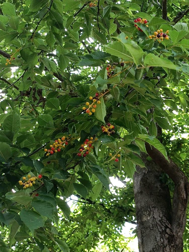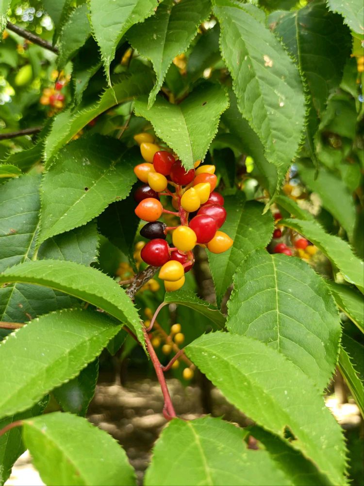 春に、サクラらしからぬ白い花がブラシ状に咲く。果実は夏に赤く熟し始め、その後黒く熟すそうで、カラフルな果実がとても目立っていました🧡❤💛💜