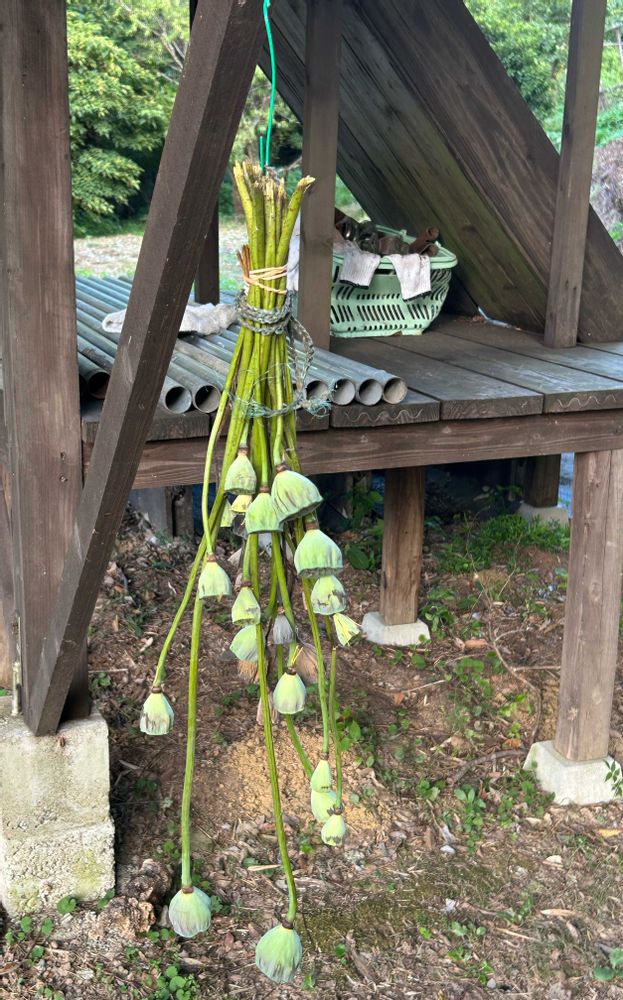 ツリーデッキ下に下げている花托(花殻)は来園記念に数本自由に持ち帰り下さい。