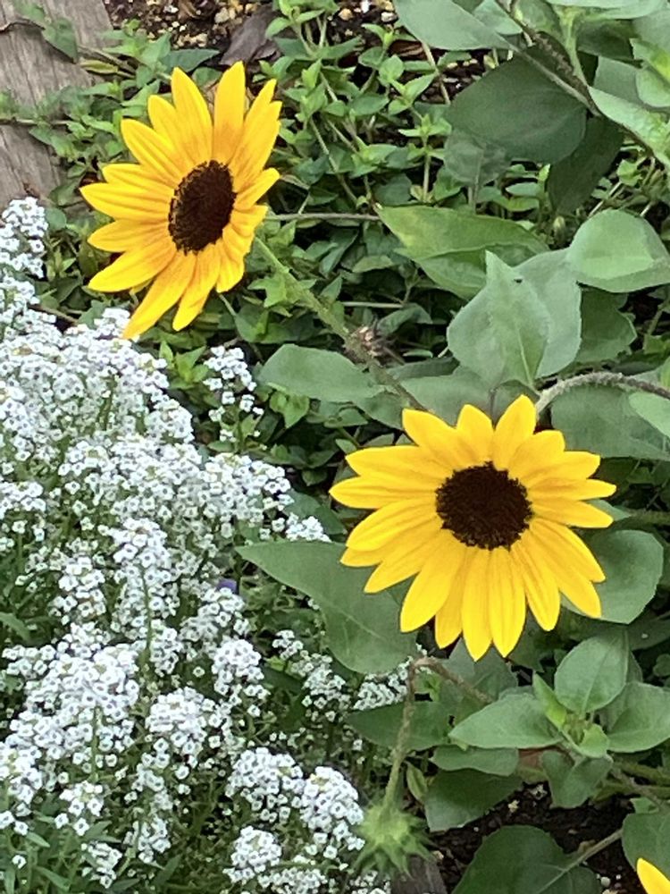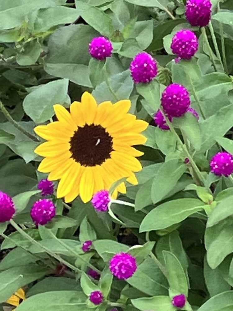 ❸ミニひまわり🌻と千日紅🩷、❹ミニひまわり🌻とアリッサム🤍