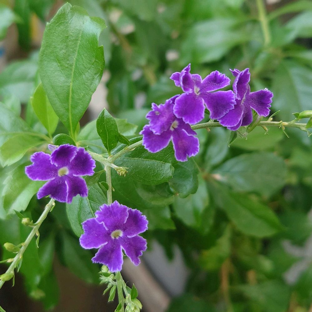 今朝、ベランダでデュランタ・タカラヅカが咲いた。深い紫に白い縁、小さなドレスが咲くの待ってた💜