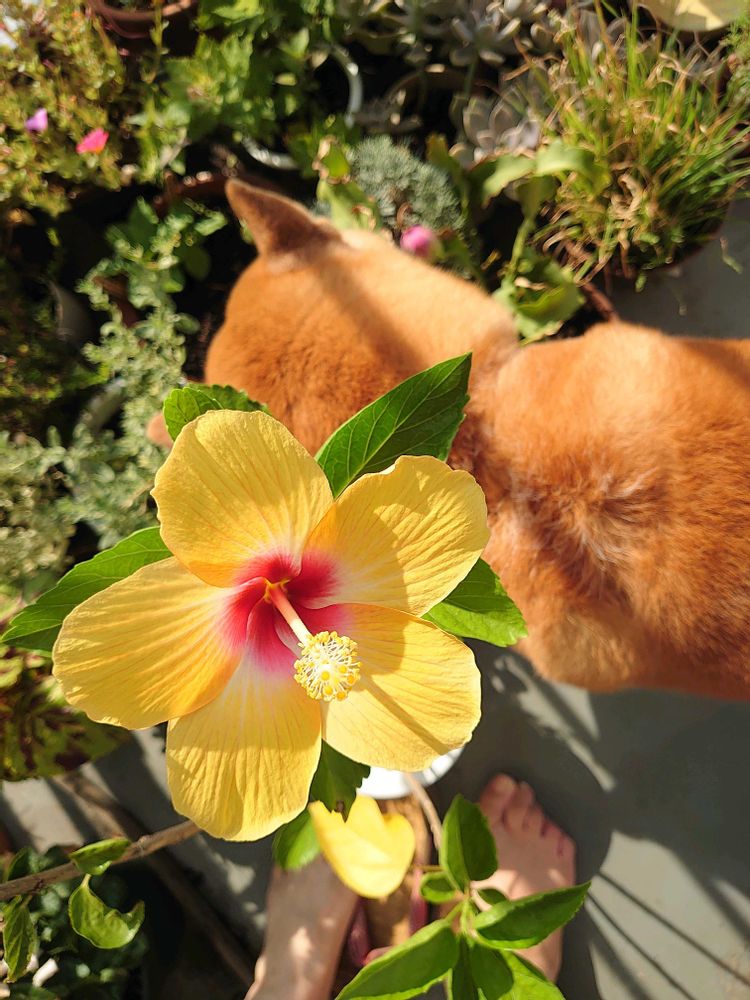 4️⃣ハイビスカス💛とてんと🐶一緒に撮りたくて慌てて撮ったら🦶自分の足が入ってたわ😅💦裸足で飛び出してた💦