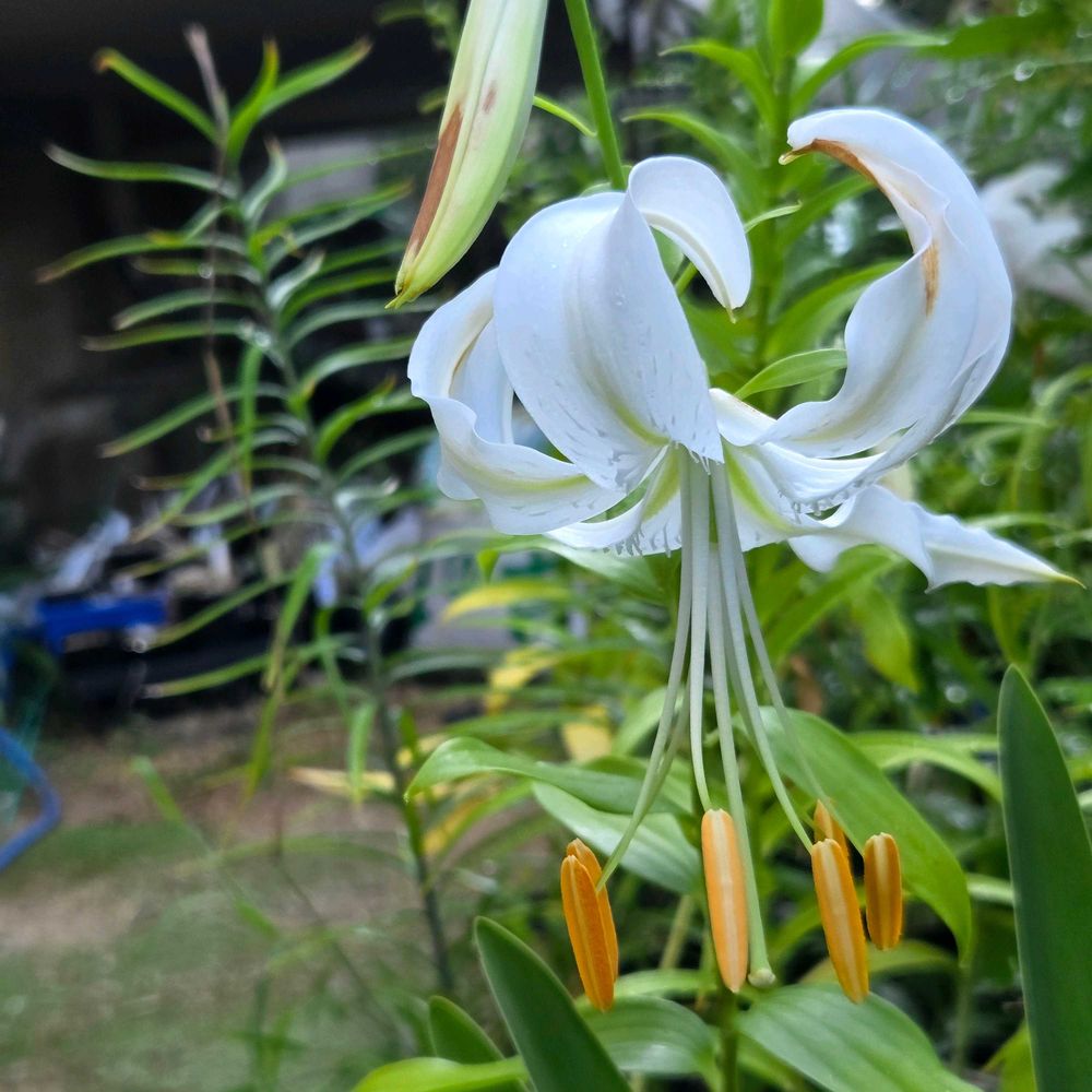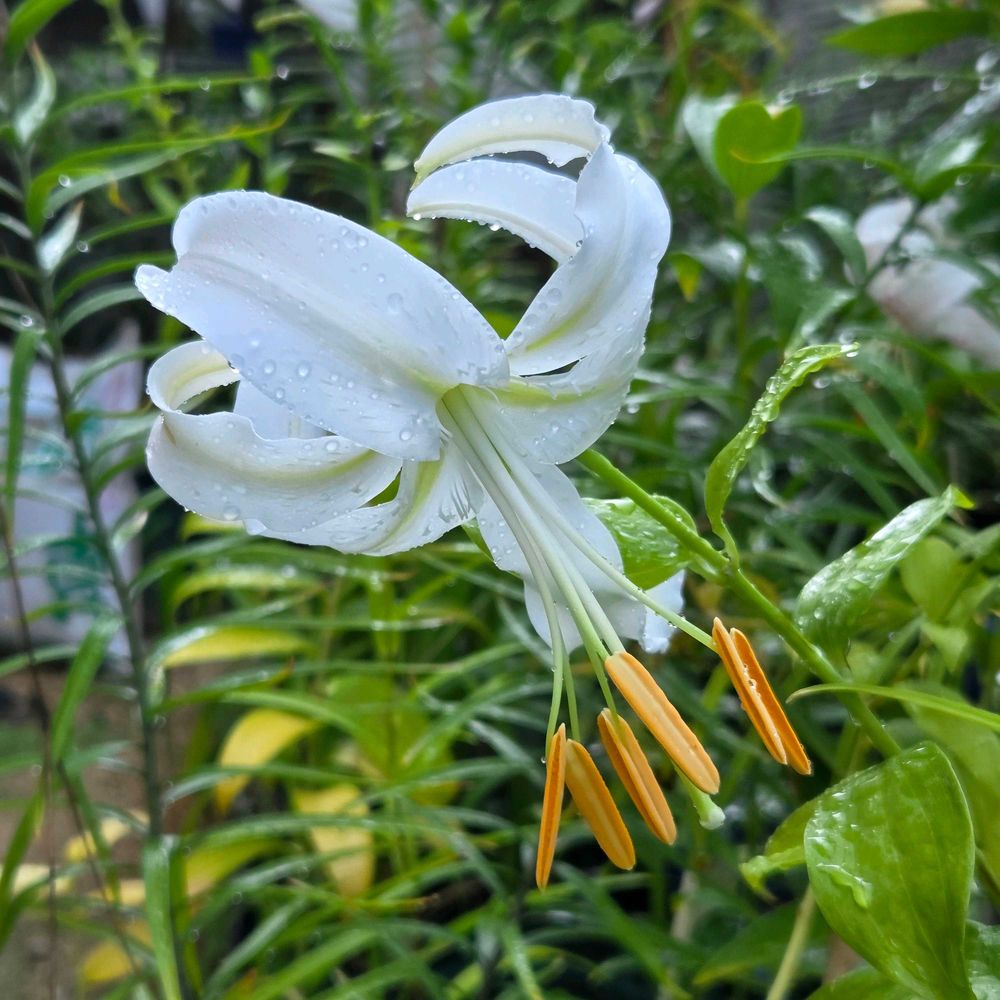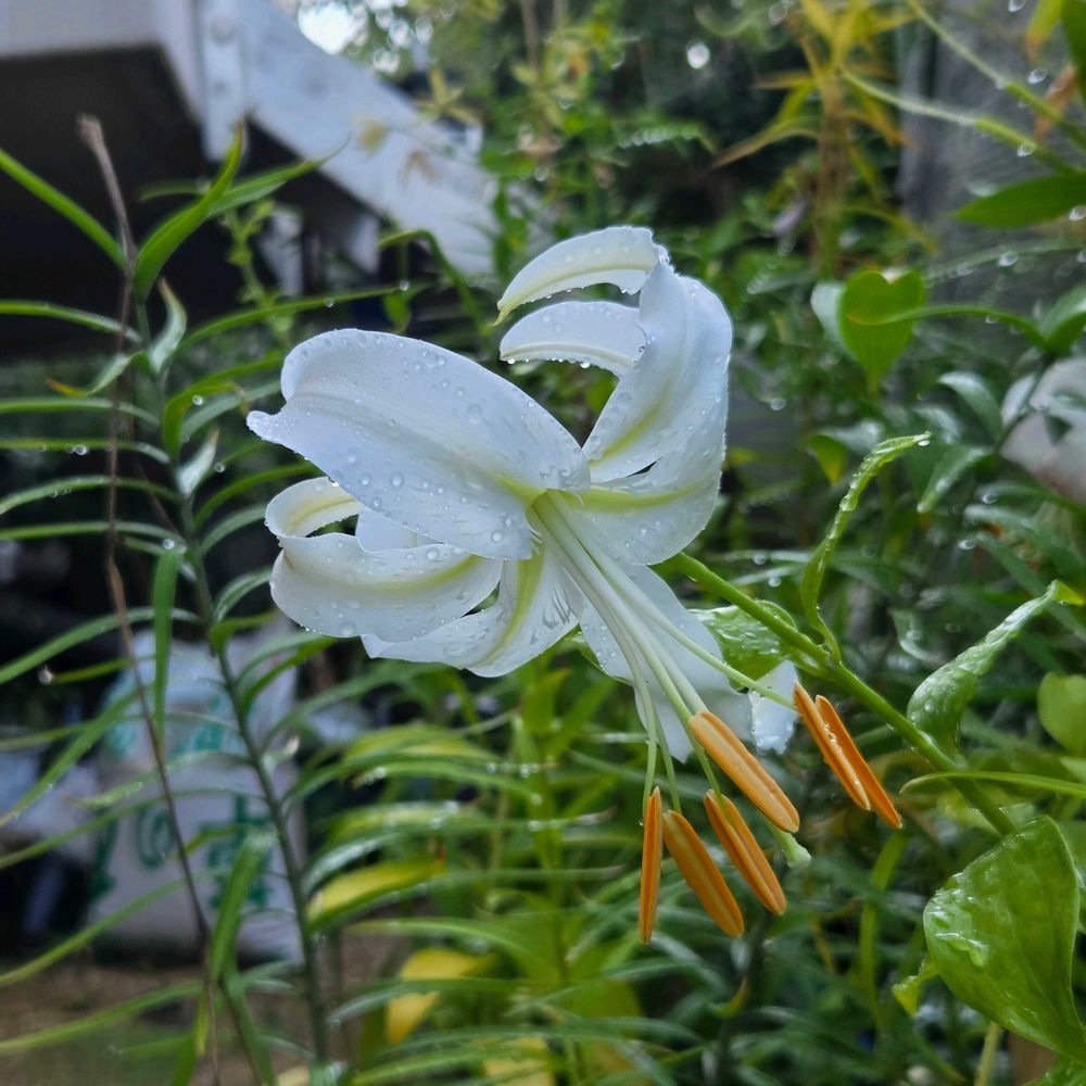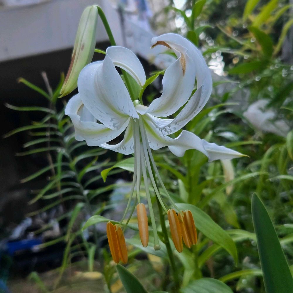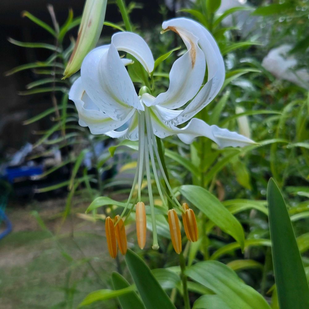 白花のカノコユリの峰の雪が開花しました!峰の雪は花粉まで色素がないタイプの個体を指します。同じシロカノコユリでも花粉の色素が残っていて、葯が茶色の個体はシラタマユリと呼ばれています!