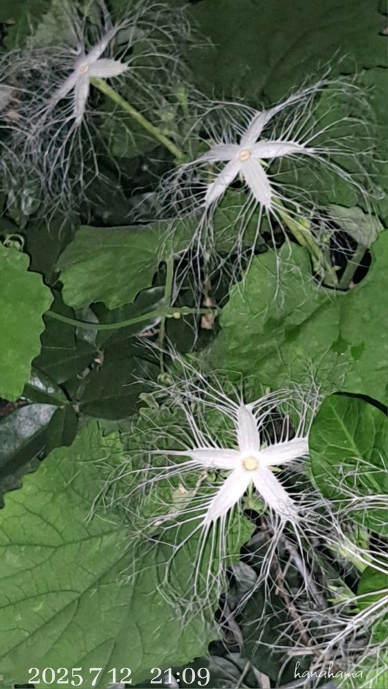 ❶夕方の蕾から開花、朝萎んだカラスウリ