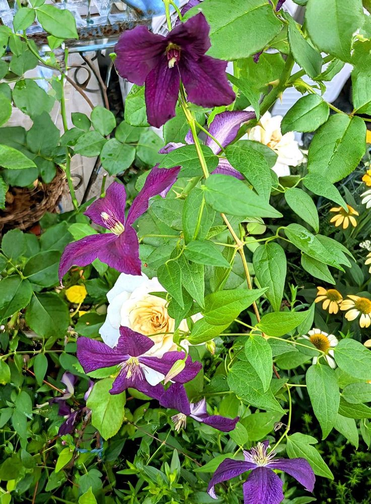 15年の眠りから目覚めたクレマチス・マダムジュリアコレボンがどんどん咲き出して…バラ・フレンチレースに絡みついています♪