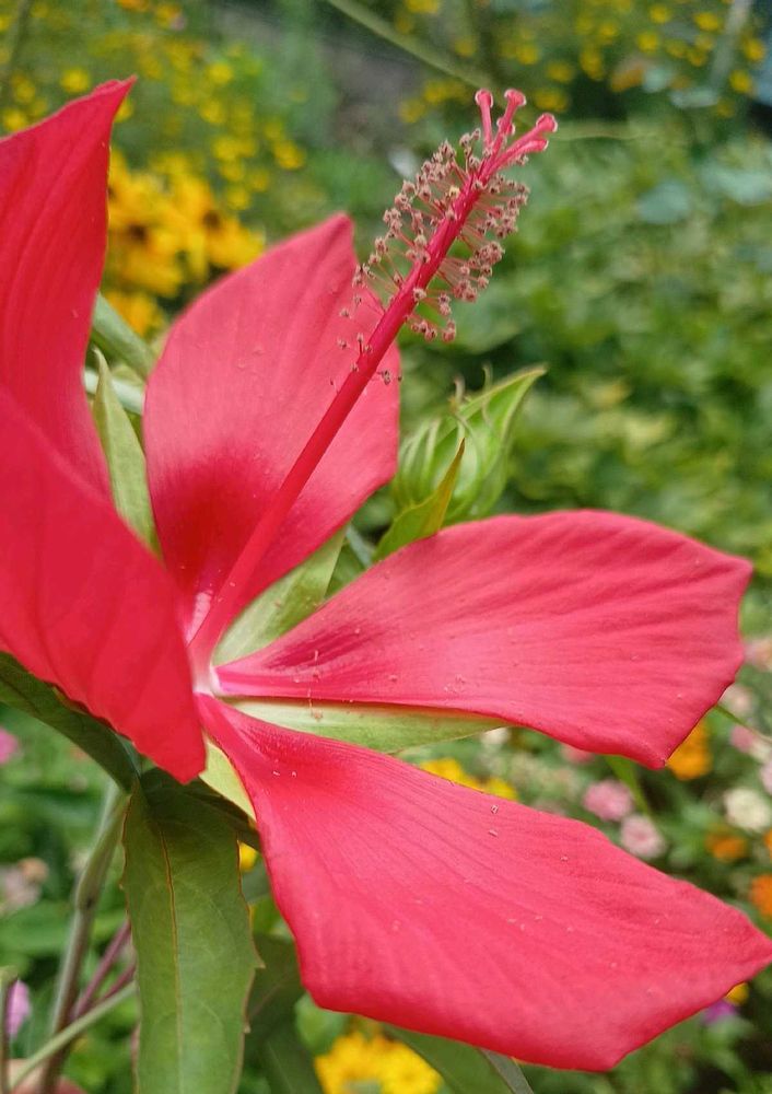 真っ赤❤️な紅葉葵さん😊そしてヒャクニチソウさんステキ(✼•ᴗ•⁎)✲*。❀.*・゚紅葉葵さん今年は近所の🏘咲いてないなぁ🤔🤔