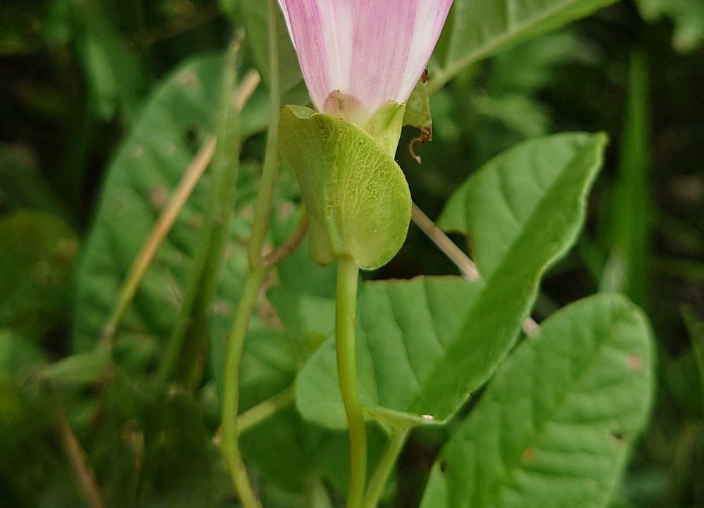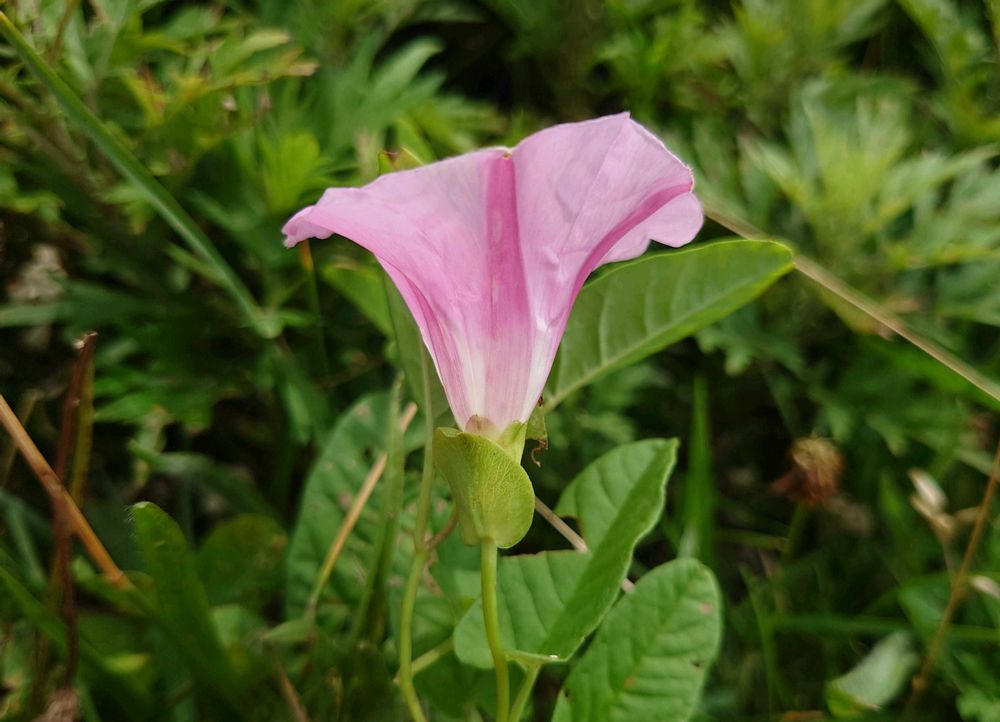 葉腋から長い花柄をだし、淡紅色の花を1個つける