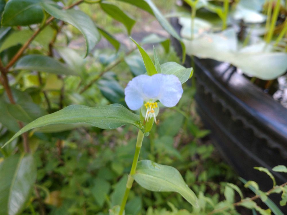 諦めた白ツユクサが、2つだけ、睡蓮鉢の近くで、