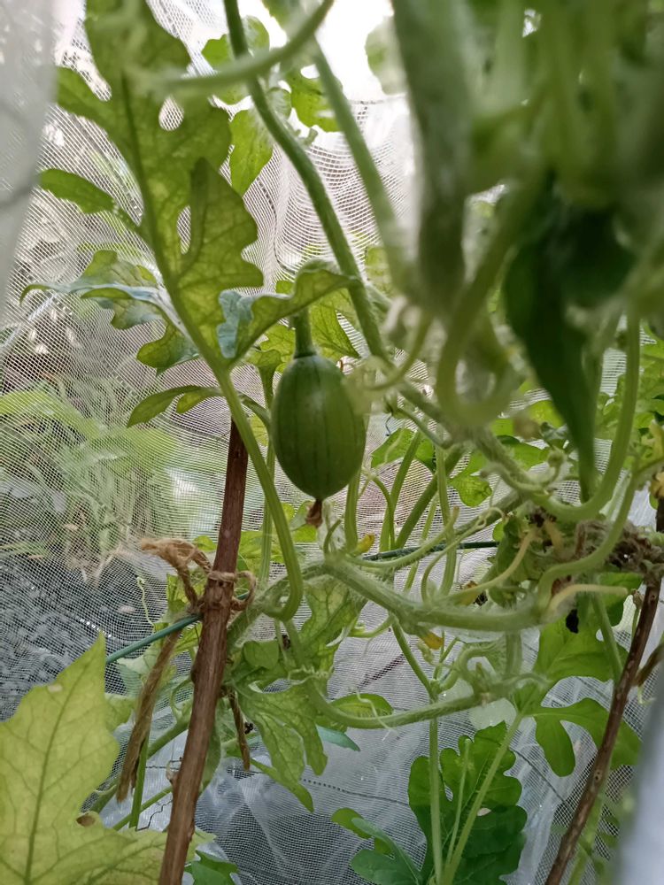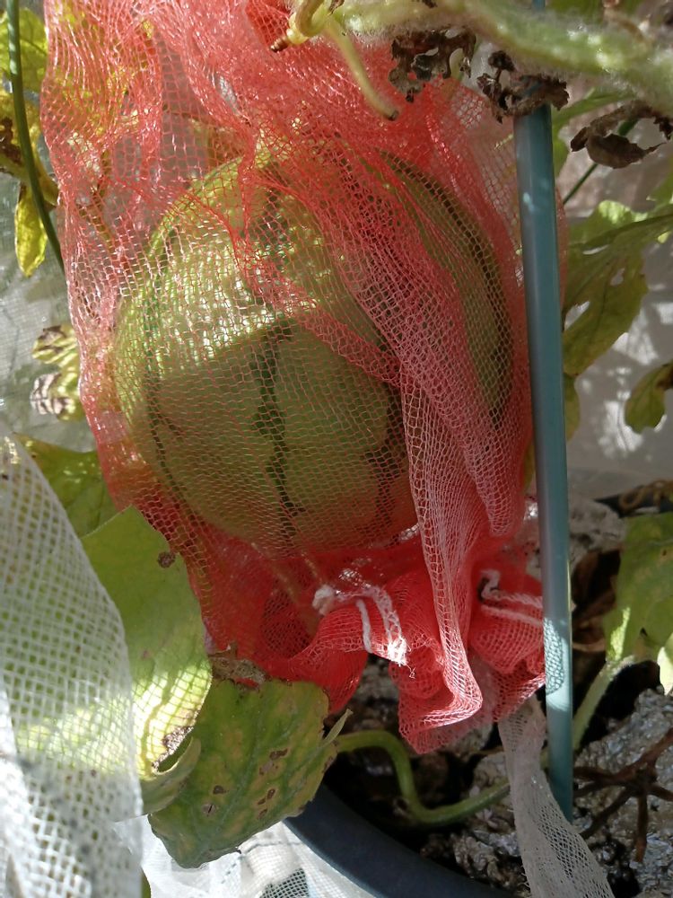 鉢植え小玉スイカ栽培、もう少しで収穫です〜赤ちゃんスイカも頑張って✨️🍉🍉🍉🎐