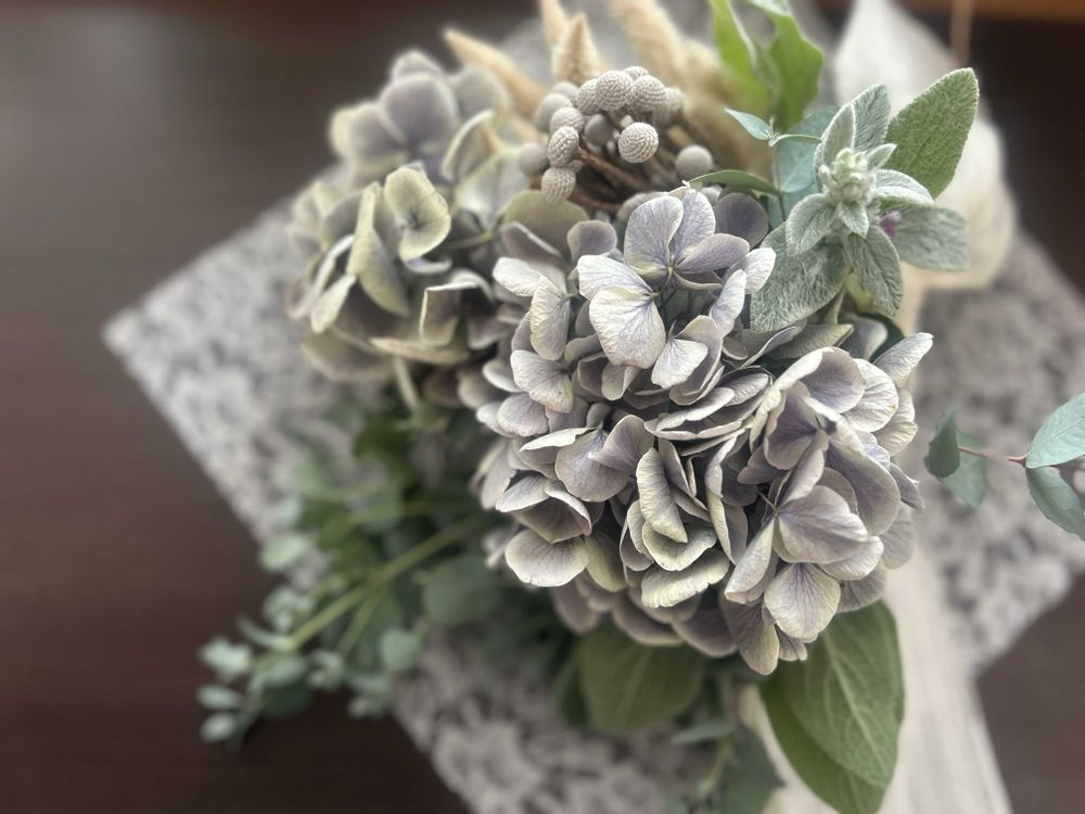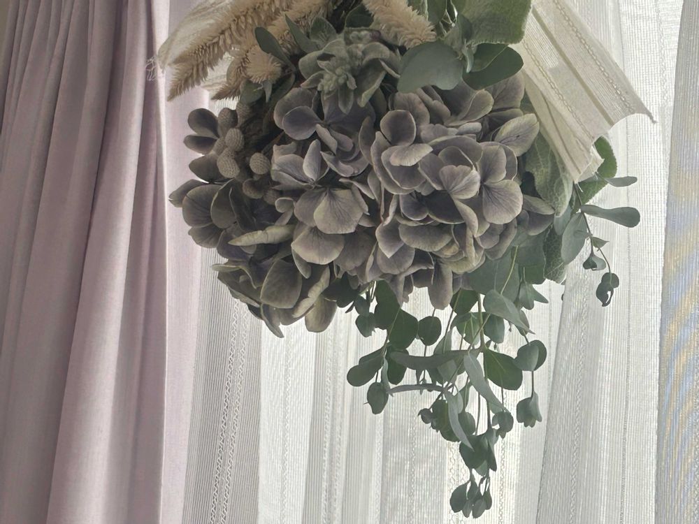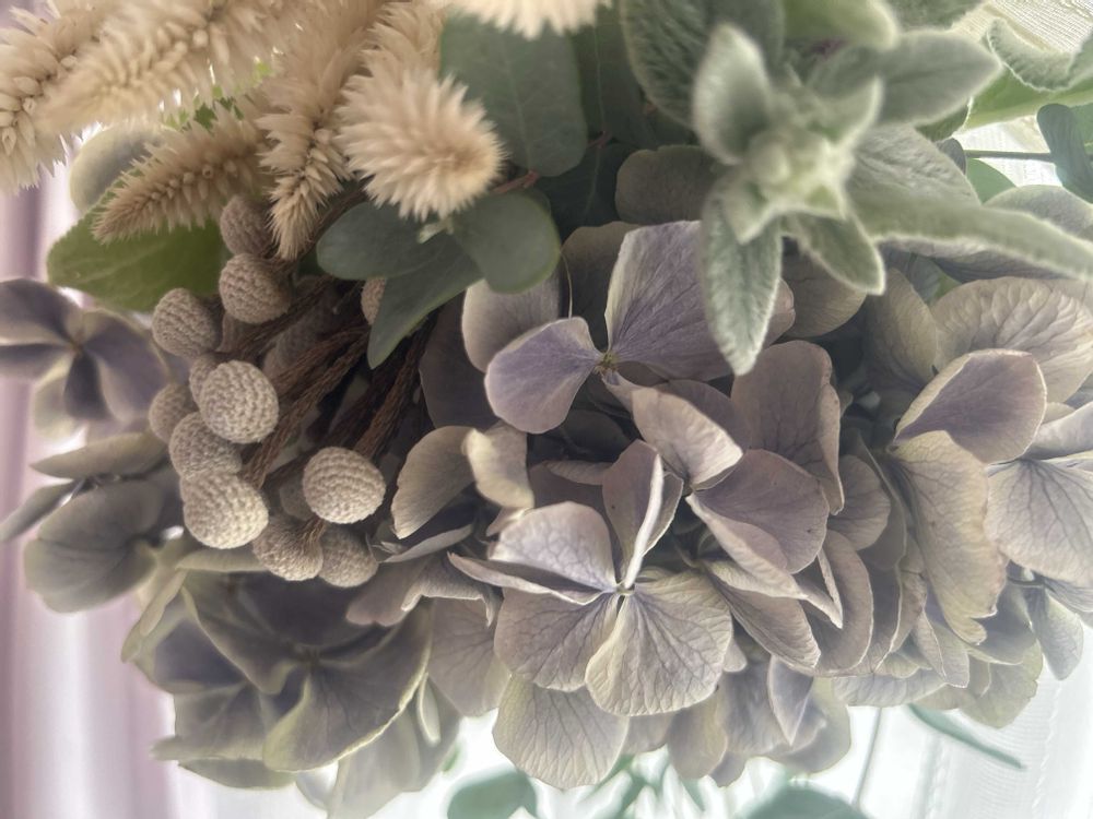 涼しいお部屋で収穫した紫陽花と溜置きしたお庭ドライフラワーにラムズイヤー、ユーカリを足してスワッグ作り🌿🌿🌿