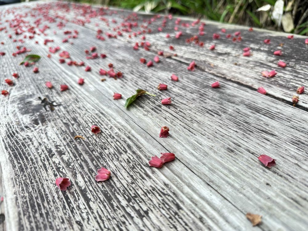 ベンチに落ちた花殻を払いのけずに別の岩に座るはなピッチさん