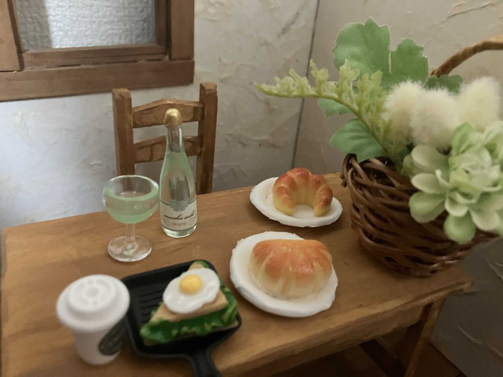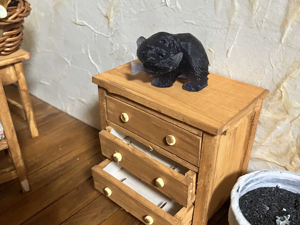 ドールハウスはテーブルのパンの皿とチェストを作りました〜上に乗っているのは木彫りのクマ風の樹脂のクマ🐻。去年北海道で欲しかった熊の置物が高すぎて買えないので買ったお土産がこんなところで活躍するとはwww