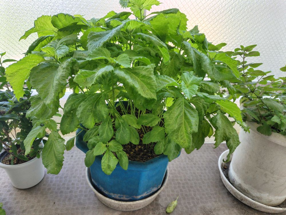 このコは日向より日陰の方が元気💪🏻なんです。以前、日向で育てた時よりよく育つし、何より葉っぱ🌿が美味しく育ちます。🤤日向で育てると固くなって美味しくないです。もう見た目からして、固そうだしキレイな緑になりません。