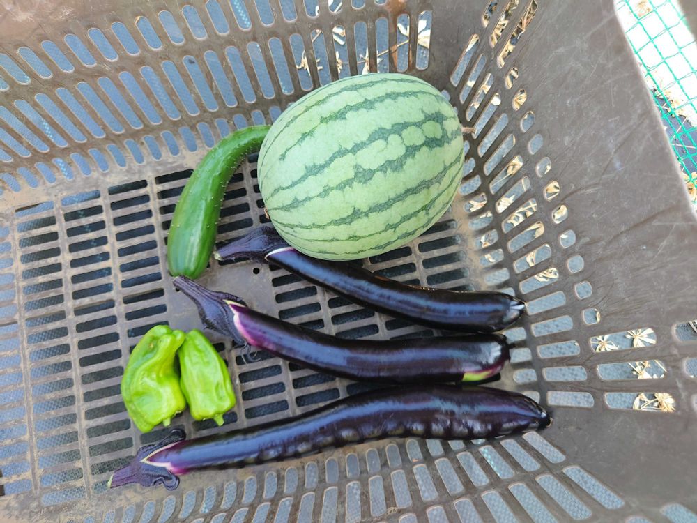 先週の収穫です。小玉スイカ(ピノガール)は今年は2玉で終わってしまいましたが、家族で食べました🍉