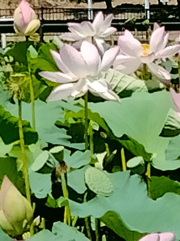 開く前の濃いピンクから開いた薄桃色の花、その間をトンボが飛び回ってました。