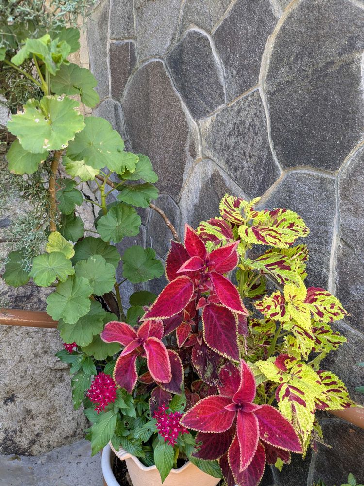 寄せ植えのコリウス、赤いペンタスは素敵に花盛り🎶