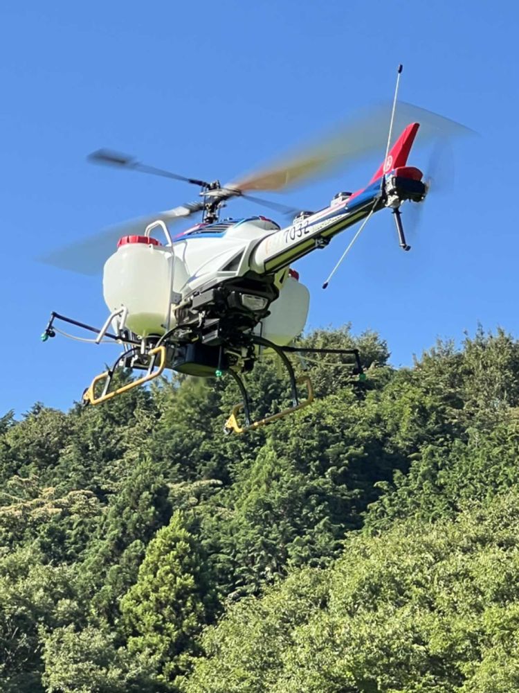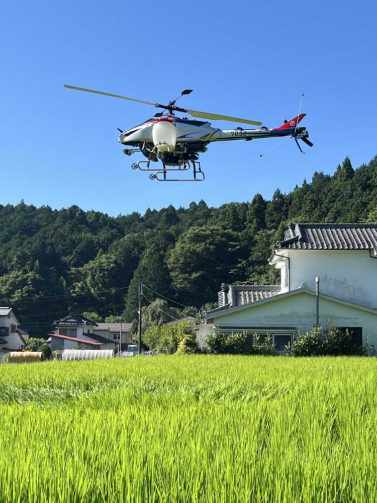 ヘリコプター型ドローンで田んぼの薬剤散布